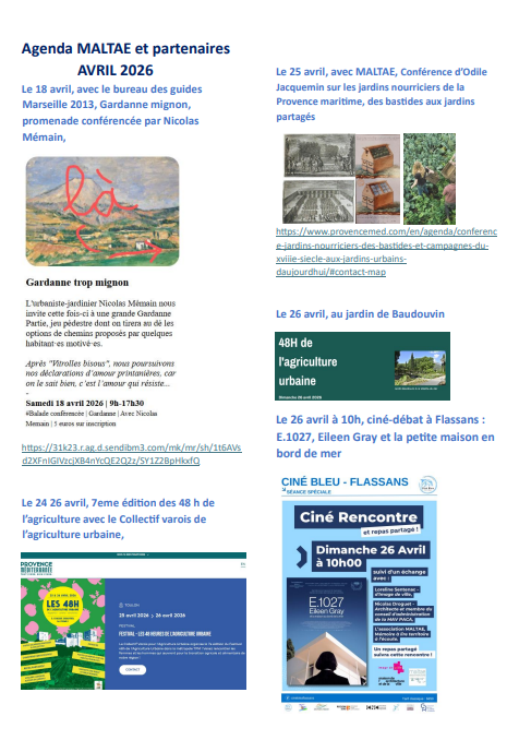 weekend du 24 au 26, la dixième édition des 48h de l’agriculture commence au jardin d’Orves à La Valette et se poursuivra au jardin de Baudouvin, Maltae s’y associe en proposant samedi 25, à 11h une conférence au CAUE du Var à Toulon sur la place des jardins nourriciers dans l’histoire ; dimanche 26 avril, Ciné débat avec Cinébleu à Flassans sur la villa l’Eileen Gray,